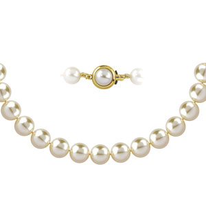 Collier plaqué or de chez 'Jouailla bijoux' (Ref: 327 743) - Diamètre des perles: 8 mm - Longueur: 40 cm - Placage 3 microns garanti 10 ans - La perle de Majorque blanche est formée à partir d’un noyau de cristal à haut indice de refraction et de reflexion qui permet la reverbération des couleurs basiques des rayons lumineux souvent associées aux couleurs de l’arc en ciel. La première usine perlière fut fondée, à la fin du XIXème siècle, avec le temps, la perle de Majorque devint une référence mondiale de qualité pour les perles d'imitation.